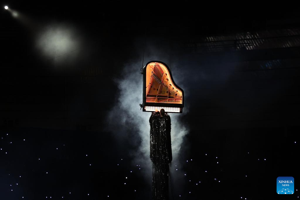 PARIS, 11 agosto, 2024 (Xinhua) -- El pianista Alain Roche interpreta el Himno a Apolo durante la ceremonia de clausura de los Juegos Olímpicos de París 2024 en el Stade de France, en París, Francia, el 11 de agosto de 2024. (Xinhua/Cao Can)