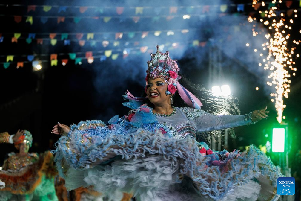 RIO DE JANEIRO, 12 agosto, 2024 (Xinhua) -- Imagen de 11 de agosto de 2024 de una juerguista del grupo de cuadrilla "Forrozao" participando en el Festival Arraiá do Río Junino en la Plaza de la Apoteosis, en Río de Janeiro, Brasil. (Xinhua/Claudia Martini)