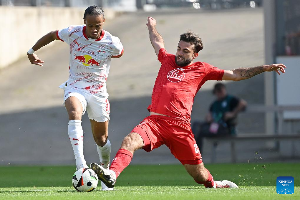 ESSEN, 18 agosto, 2024 (Xinhua) -- Imagen del 17 de agosto de 2024 de Damien Safi (d), de Rot-Weiss Essen, disputando el balón con Lukas Klostermann, de RB Leipzig, durante el partido correspondiente a la primera ronda de la Copa de Alemania entre Rot-Weiss Essen y RB Leipzig, en Essen, Alemania. (Xinhua/Ulrich Hufnagel)