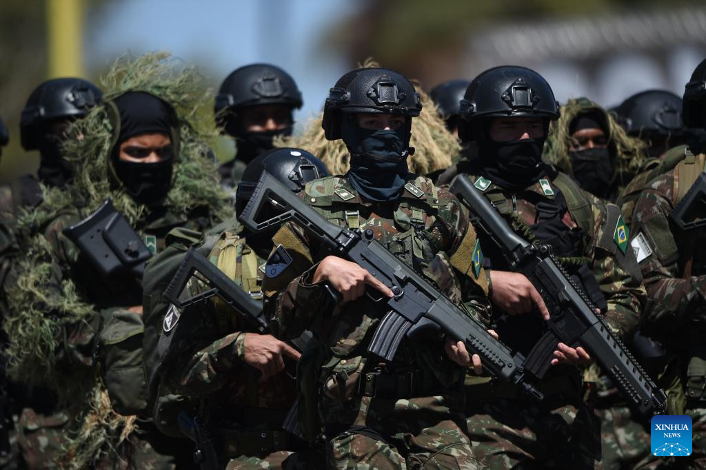 BRASILIA, 22 agosto, 2024 (Xinhua) -- Soldados del Ejército brasileño marchan durante el desfile militar en conmemoración del Día del Soldado, en Brasilia, Brasil, el 22 de agosto de 2024. (Xinhua/Lucio Tavora)