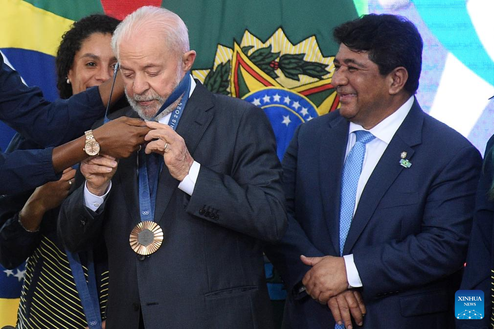 (240826) -- BRASILIA, 26 agosto, 2024 (Xinhua) -- El presidente brasileño, Luiz Inácio Lula da Silva (i-frente), se coloca una medalla olímpica durante una reunión con atletas que participaron en los Juegos Olímpicos de París 2024, en el Palacio de Planalto, en Brasilia, Brasil, el 26 de agosto de 2024. (Xinhua/Lucio Tavora) (lt) (rtg) (ah) (ce)