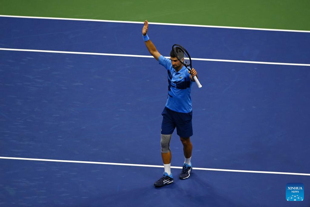NUEVA YORK, 27 agosto, 2024 (Xinhua) -- Imagen del 26 de agosto de 2024 de Novak Djokovic, de Serbia, festejando al término del partido de la primera ronda de individuales masculinos ante Radu Albot, de Moldavia, en el campeonato de tenis US Open 2024, en Nueva York, Estados Unidos. (Xinhua/Li Rui)