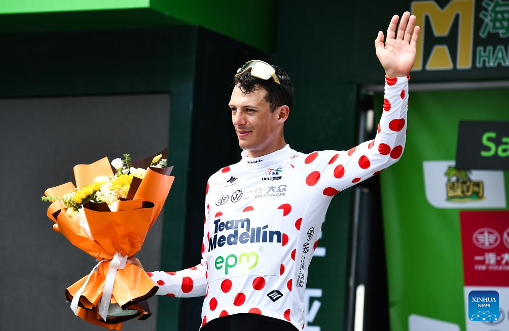 SANYA, 31 agosto, 2024 (Xinhua) -- Wilmar Andrés Paredes Zapata de Colombia festeja con el maillot de lunares al término de la Etapa 5 de la 15 carrera ciclista del Tour de la Isla de Hainan de Changjiang a Sanya, en la provincia de Hainan, en el sur de China, el 31 de agosto de 2024. (Xinhua/Yang Guanyu)
