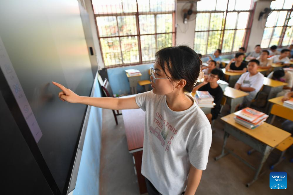 HUARONG, 1 septiembre, 2024 (Xinhua) -- Una maestra ajusta un pizarrón inteligente en la escuela de Tuanzhou, en el municipio de Tuanzhou del distrito de Huarong, en la provincia de Hunan, en el centro de China, el 1 de septiembre de 2024. La escuela ha llevado a cabo renovaciones después de las fuertes lluvias, y esta lista para el nuevo semestre. (Xinhua/Chen Zeguo)