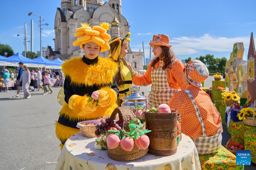 VLADIVOSTOK, 12 septiembre, 2024 (Xinhua) -- Niñas en disfraces de abeja son vistas durante el "Día de la Miel" llevado a cabo en Vladivostok, Rusia, el 12 de septiembre de 2024. (Xinhua/Guo Feizhou)