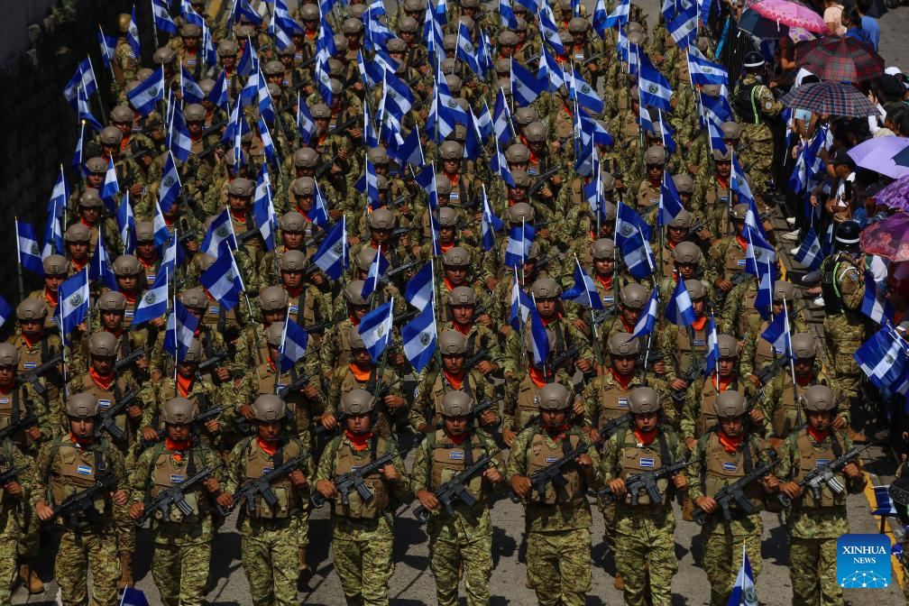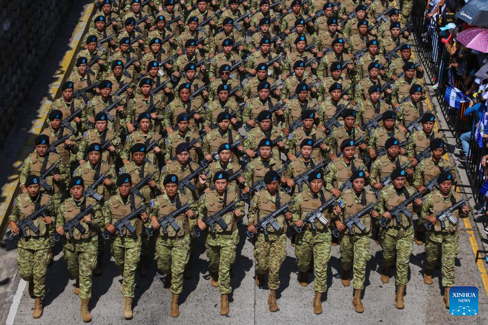 SAN SALVADOR, 15 septiembre, 2024 (Xinhua) -- Soldados del Ejército de El Salvador marchan durante un desfile militar en conmemoración del 203° aniversario de la Independencia de El Salvador, en el departamento de San Salvador, El Salvador, el 15 de septiembre de 2024. (Xinhua/Alexander Peña)