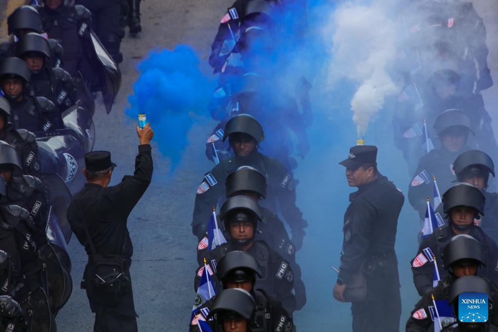SAN SALVADOR, 15 septiembre, 2024 (Xinhua) -- Agentes de la Unidad de Mantenimiento del Orden de la Policía Nacional Civil realizan un simulacro de disturbios lanzando humo con los colores de la bandera de El Salvador durante un desfile militar en conmemoración del 203° aniversario de la Independencia de El Salvador, en el departamento de San Salvador, El Salvador, el 15 de septiembre de 2024. (Xinhua/Alexander Peña)
