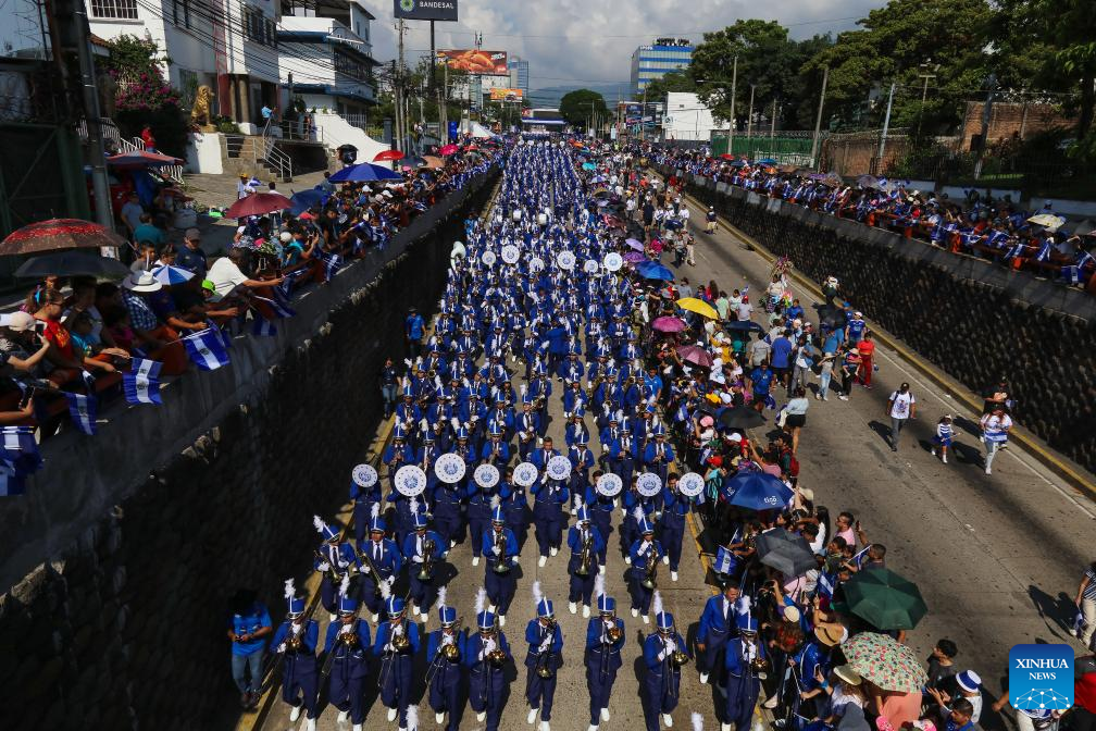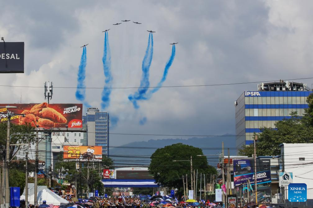 SAN SALVADOR, 15 sep (Xinhua) -- Miles de salvadoreños disfrutaron este domingo, y en medio de un ambiente festivo, el desfile de Independencia, en su 203 aniversario, con música, bailes y un impresionante espectáculo aéreo.