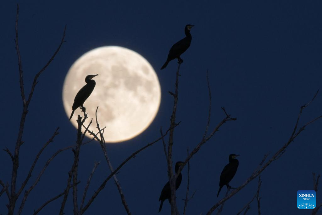 BEIJING, 17 septiembre, 2024 (Xinhua) -- La silueta de un cormorán es vista frente a la luna llena, en Qiqihar, en la provincia de Heilongjiang, en el noreste de China, el 17 de septiembre de 2024. El Festival de Medio Otoño en China, que se celebra anualmente el día 15 del octavo mes del calendario lunar chino, cae este año el 17 de septiembre. Como una de las festividades tradicionales más importantes de China, es un momento alegre en el que las familias se reúnen, aprecian la luna llena y comparten pasteles de luna, un pastel tradicional, para conmemorar la temporada de la cosecha. (Xinhua/Wang Yonggang)