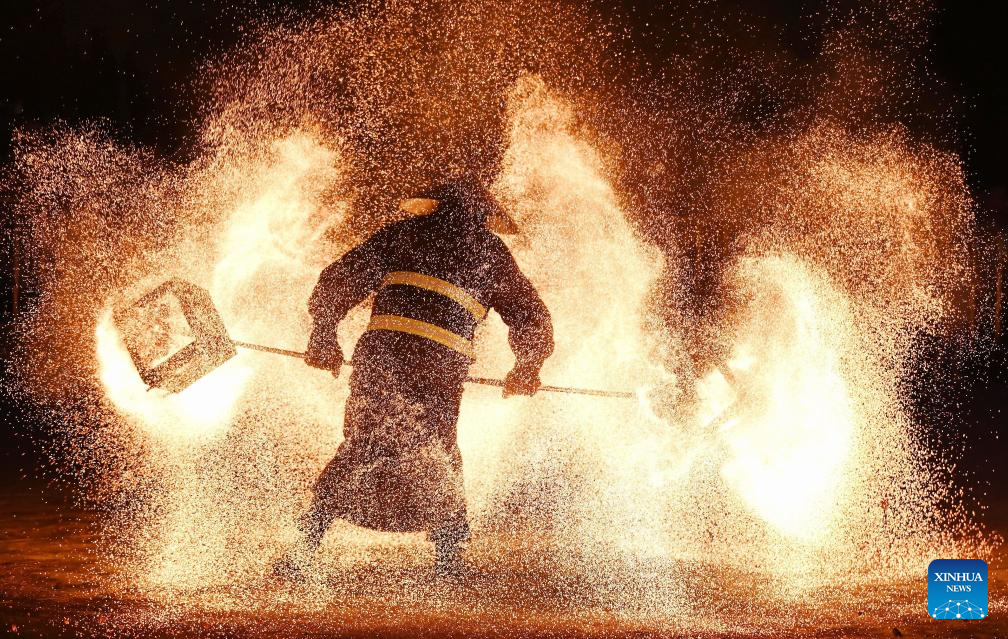 BEIJING, 17 septiembre, 2024 (Xinhua) -- Imagen del 16 de septiembre de 2024 de artistas folclóricos lanzando hierro fundido para crear fuegos artificiales para los turistas, en Tangshan, en la provincia de Hebei, en el norte de China. Los chinos disfrutaron de tres días de vacaciones por el Festival de Medio Otoño, que este año cayó el 17 de septiembre. (Xinhua/Liu Mancang)
