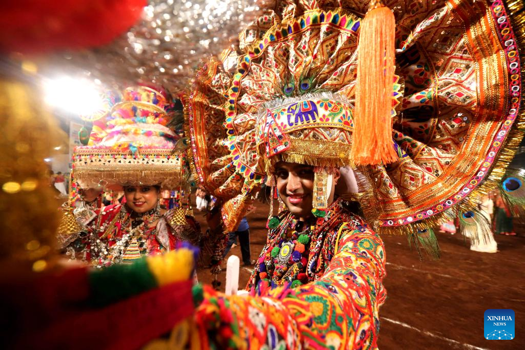 BHOPAL, 5 octubre, 2024 (Xinhua) -- Imagen del 4 de octubre de 2024 de devotos hindúes realizando la danza Garba durante el festival Navratri, en Bhopal, capital del estado de Madhya Pradesh, India. (Xinhua/Str)