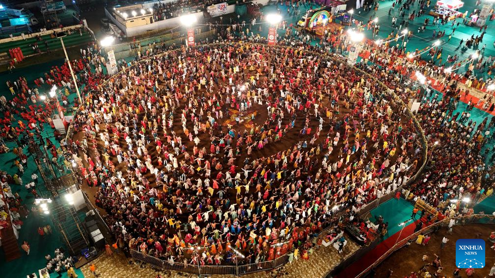 BHOPAL, 5 octubre, 2024 (Xinhua) -- Vista aérea tomada con un dron el 5 de octubre de 2024 de devotos hindúes realizando la danza Garba durante el festival Navratri, en Bhopal, capital del estado de Madhya Pradesh, India. (Xinhua/Str)