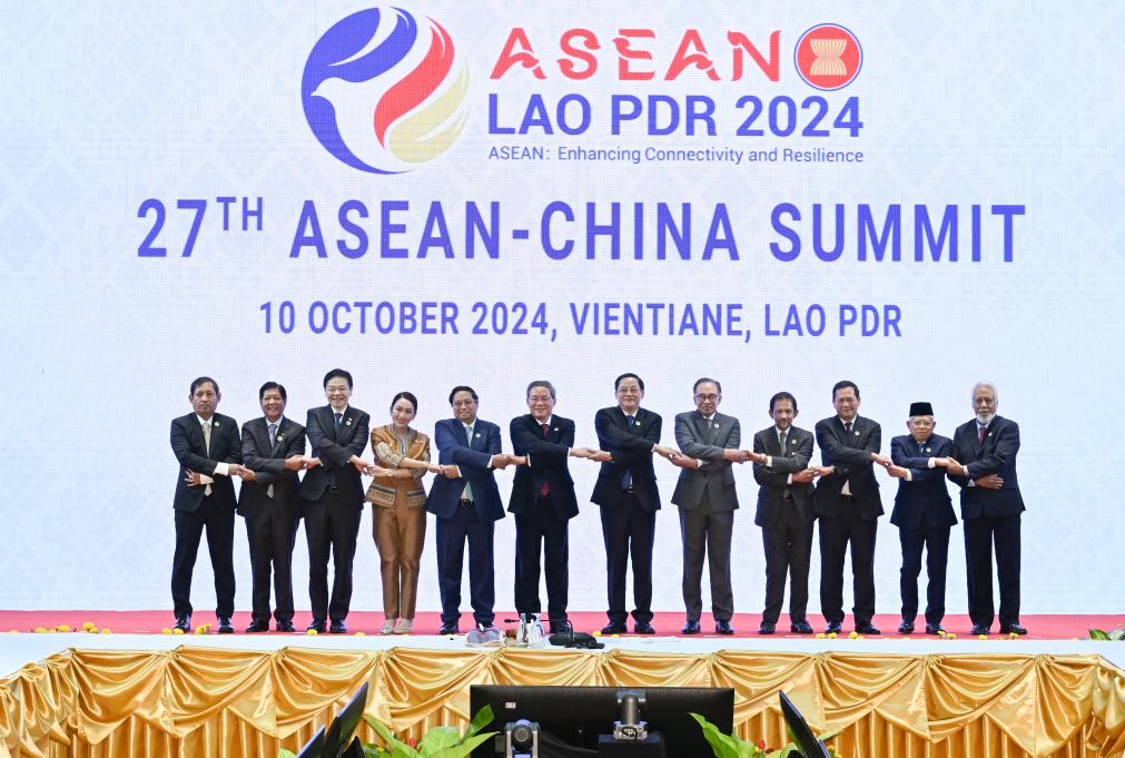 VIENTIAN, 10 octubre, 2024 (Xinhua) -- El primer ministro chino, Li Qiang, asiste a la 27ª cumbre China-ASEAN, en Vientián, Laos, el 10 de octubre de 2024. (Xinhua/Li Tao)