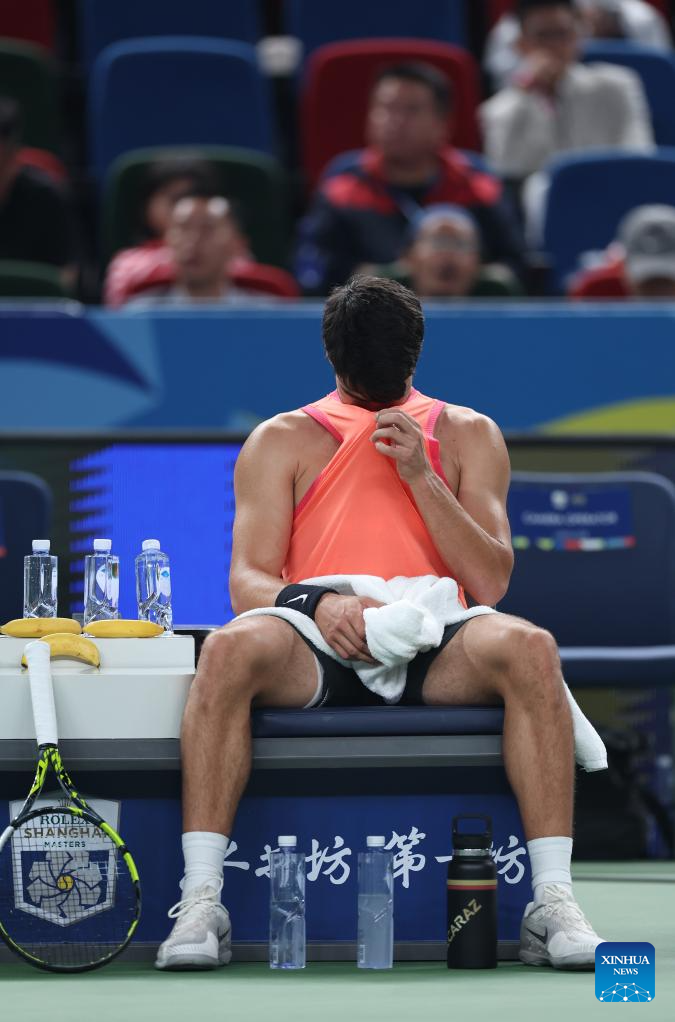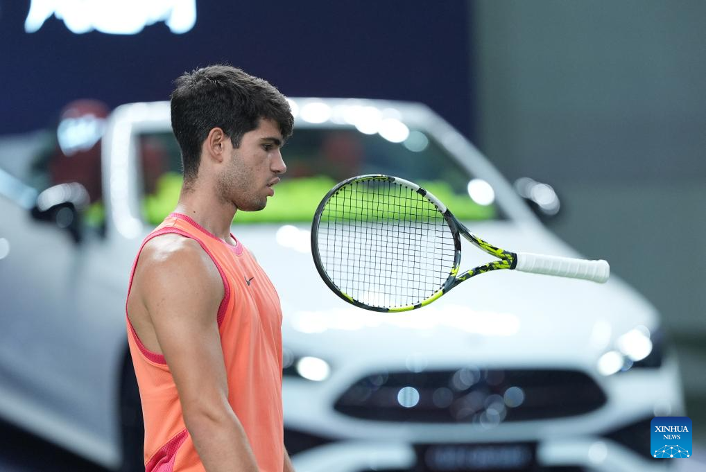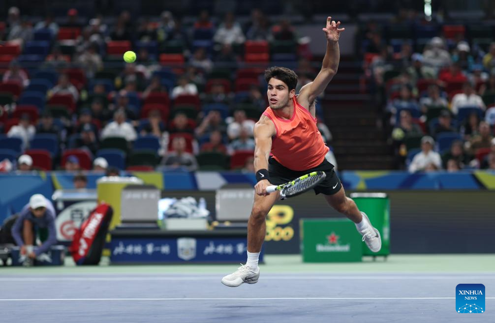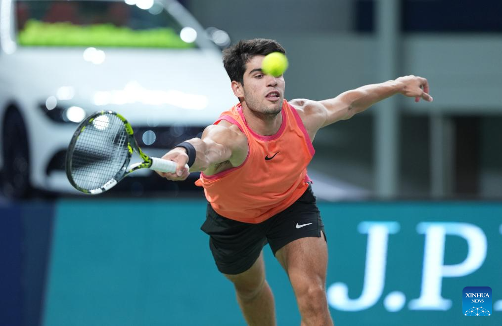 SHANGHAI, 10 octubre, 2024 (Xinhua) -- Carlos Alcaraz devuelve la pelota durante el partido de cuartos de final de individuales masculinos entre Carlos Alcaraz, de España, y Tomas Machac, de República Checa, en el torneo de tenis Masters de Shanghai en el ATP World Tour, en Shanghai, en el este de China, el 10 de octubre de 2024. (Xinhua/Bai Xuefei)