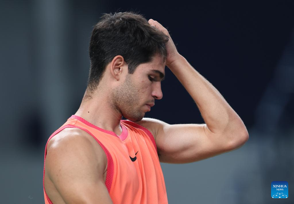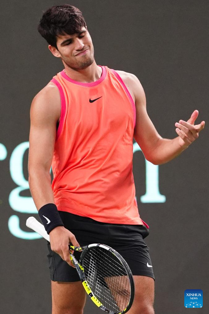 SHANGHAI, 10 octubre, 2024 (Xinhua) -- Carlos Alcaraz reacciona durante el partido de cuartos de final de individuales masculinos entre Carlos Alcaraz, de España, y Tomas Machac, de República Checa, en el torneo de tenis Masters de Shanghai en el ATP World Tour, en Shanghai, en el este de China, el 10 de octubre de 2024. (Xinhua/Xu Yanan)
