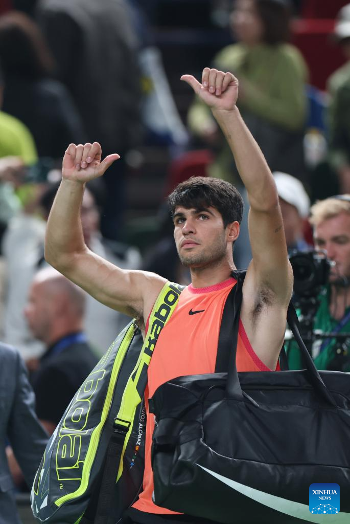SHANGHAI, 10 octubre, 2024 (Xinhua) -- Carlos Alcaraz saluda a los espectadores al término del partido de cuartos de final de individuales masculinos entre Carlos Alcaraz, de España, y Tomas Machac, de República Checa, en el torneo de tenis Masters de Shanghai en el ATP World Tour, en Shanghai, en el este de China, el 10 de octubre de 2024. (Xinhua/Bai Xuefei)