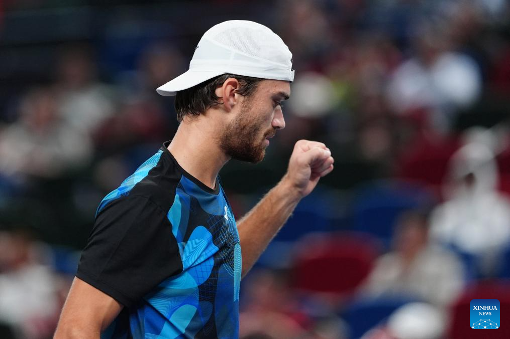 SHANGHAI, 10 octubre, 2024 (Xinhua) -- Tomas Machac festeja un punto durante el partido de cuartos de final de individuales masculinos entre Carlos Alcaraz, de España, y Tomas Machac, de República Checa, en el torneo de tenis Masters de Shanghai en el ATP World Tour, en Shanghai, en el este de China, el 10 de octubre de 2024. (Xinhua/Xu Yanan)