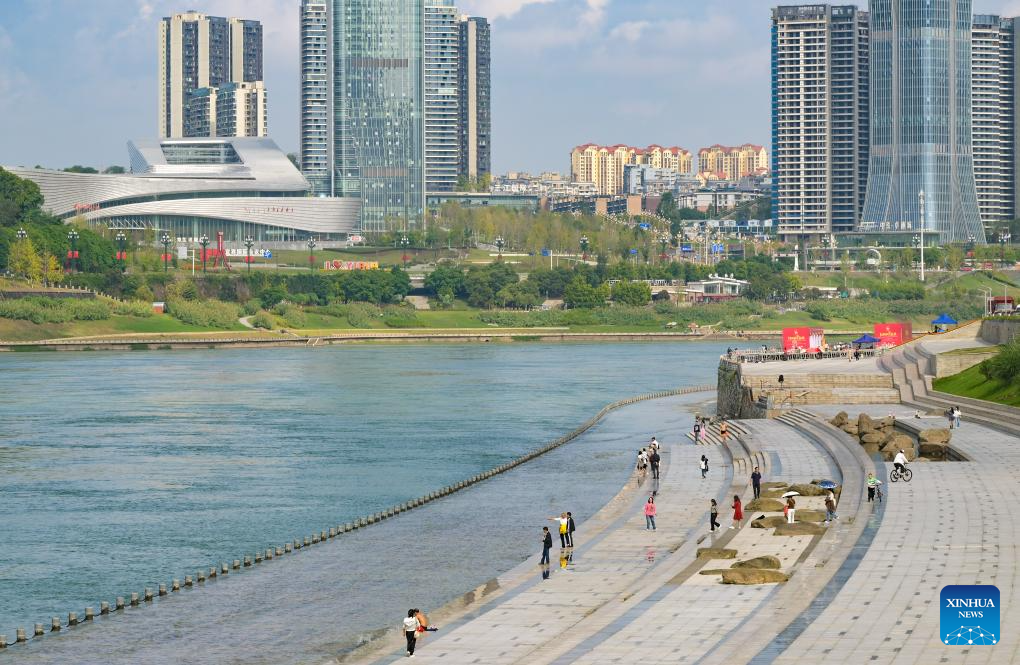 YIBIN, 18 octubre, 2024 (Xinhua) -- Imagen del 13 de octubre de 2024 de personas caminando por una calle ribereña del Parque Sanjiangkou del río Yangtze, en la ciudad de Yibin, en la provincia de Sichuan, en el suroeste de China. La ciudad de Yibin es un importante refugio ecológico y una base de conservación de fuentes de agua en los tramos superiores del río Yangtze. El río Yangtze, el río Jinsha y el río Minjiang confluyen en el centro de la ciudad de Yibin. En los últimos años, el gobierno local ha realizado esfuerzos en la mejora del entorno ecológico, incluyendo la construcción de corredores ecológicos, la mejora de la vegetación a lo largo de la ribera, y la aplicación de la prohibición de pesca en el río Yangtze. (Xinhua/Li He)