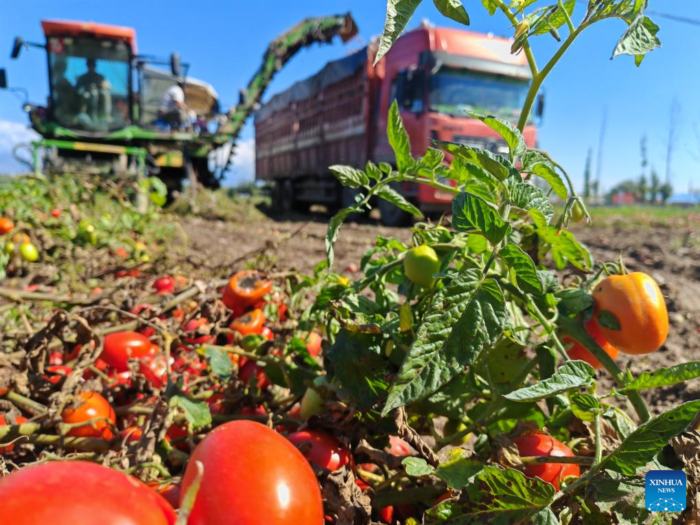 URUMQI, 31 octubre, 2024 (Xinhua) -- Imagen tomada con un teléfono móvil el 12 de septiembre de 2024 de una recolectora cosechando tomates, en Bole, en la región autónoma uygur de Xinjiang, en el noroeste de China. El cultivo y procesamiento de tomates en la región autónoma uygur de Xinjiang, en el noroeste de China, continúan logrando altos rendimientos este año, contribuyendo al desarrollo económico local y generando más ingresos a los agricultores. (Xinhua/Gou Lifeng)