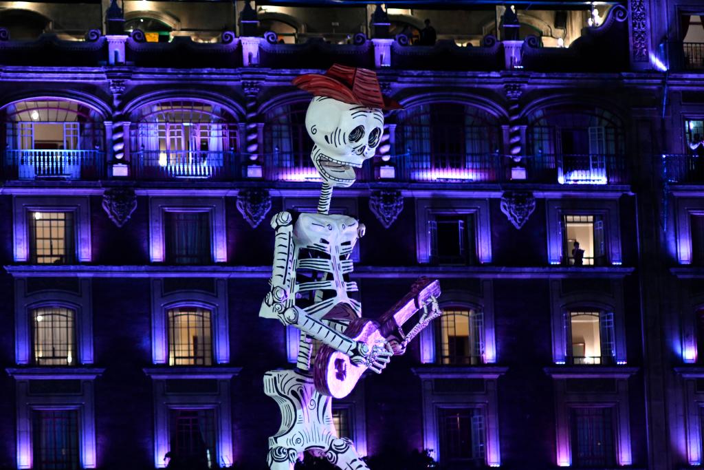 CIUDAD DE MÉXICO, 3 noviembre, 2024 (Xinhua) -- Imagen del 2 de noviembre de 2024 de una escultura de un esqueleto gigante vista en la Plaza de la Constitución mientras las personas celebran el Día de Muertos, en la Ciudad de México, capital de México. El Día de Muertos de México es una celebración vibrante donde las familias honran y recuerdan a sus seres queridos fallecidos. (Xinhua/Li Muzi)