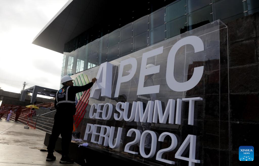 Imagen del 11 de noviembre de 2024 de un trabajador instalando un letrero de la cumbre del Foro de Cooperación Económica Asia-Pacífico (APEC), en Lima, Perú. La presidenta de Perú, Dina Boluarte, pidió a todos los ciudadanos de este país sudamericano ser "los mejores anfitriones" de la Semana de Líderes de la APEC que se desarrolla en Lima. (Xinhua/Mariana Bazo)