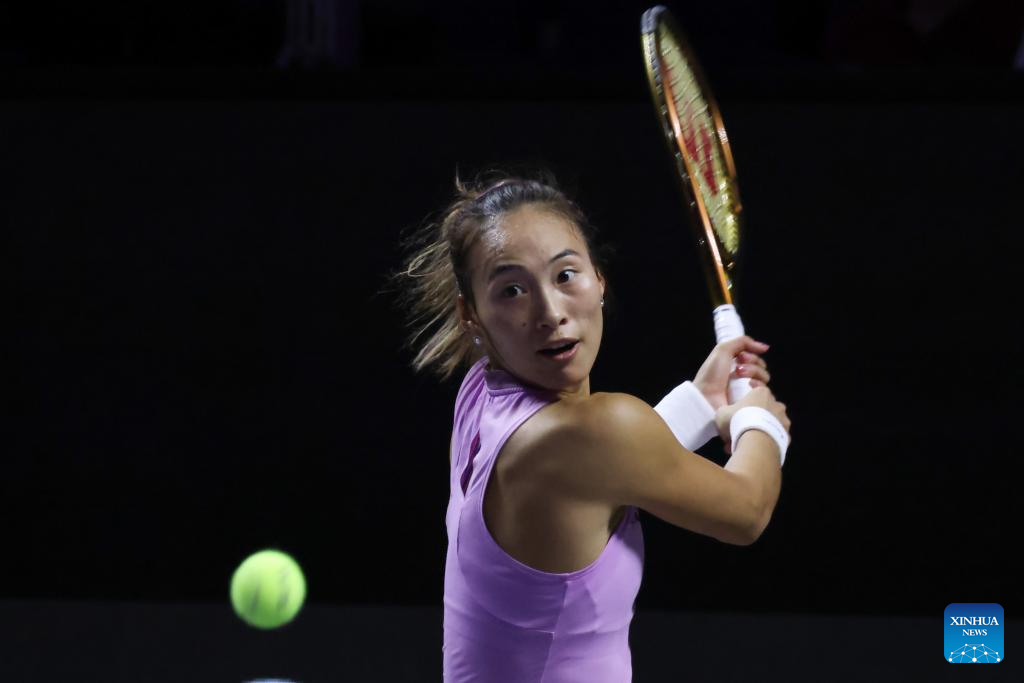 RIAD, 10 noviembre, 2024 (Xinhua) -- Imagen del 9 de noviembre de 2024 de Zheng Qinwen, de China, devolviendo la pelota durante el partido final ante Coco Gauff, de Estados Unidos, en el torneo de tenis de las Finales de la WTA, en Riad, Arabia Saudita. (Xinhua/Wang Haizhou)