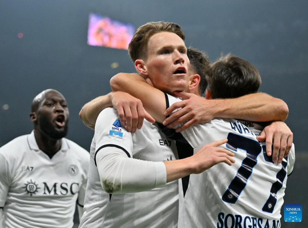 MILAN, 11 noviembre, 2024 (Xinhua) -- Imagen del 10 de noviembre de 2024 de Scott McTominay, de Napoli, festejando su anotación con sus compañeros, durante el partido de fútbol de la Serie A entre Inter de Milán y Napoli, en Milán, Italia. (Xinhua/Alberto Lingria)