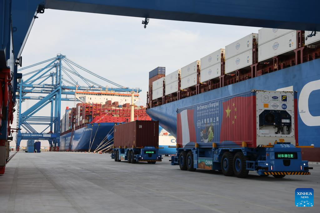 CHANCAY, 15 noviembre, 2024 (Xinhua) -- Imagen del 14 de noviembre de 2024 de una vista del puerto de Chancay, en Perú. La ceremonia de inauguración del puerto de Chancay se llevó a cabo el 14 de noviembre, hora local. El puerto de Chancay no solo es un proyecto importante en el marco de la cooperación de la Franja y la Ruta, sino también el primer puerto inteligente y ecológico de América del Sur. La primera fase del proyecto, cuando esté terminada, reducirá el tiempo de transporte marítimo desde Perú hasta China a 23 días, lo que reducirá los costos logísticos en al menos un 20 por ciento. (Xinhua/Li Mengxin)