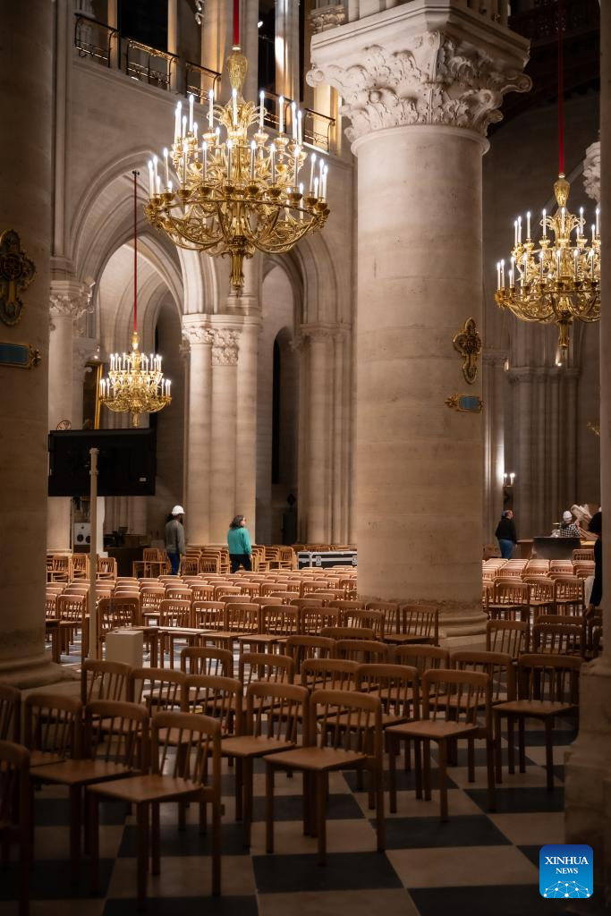 PARIS, 6 diciembre, 2024 (Xinhua) -- Imagen del 30 de noviembre de 2024 del interior de la Catedral de Notre Dame antes de su reapertura, en París, Francia. Las ceremonias de reapertura de la Catedral de Notre Dame, dañada por un gran incendio en 2019, se llevarán a cabo el 7 y 8 de diciembre. (Xinhua/Julio Piatti)