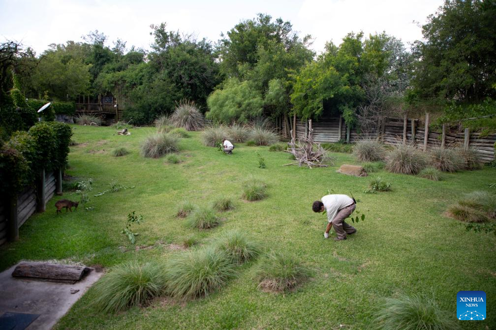 Imagen del 6 de diciembre de 2024 de cuidadores realizando un enriquecimiento ambiental en el sector donde habitan ejemplares de pudú en el Bioparque y Fundación Temaikén, en la ciudad de Escobar, Argentina. Un ejemplar de pudú, uno de los ciervos más pequeños del mundo, nació recientemente en Argentina, en un bioparque donde expertos se dedican con esmero a la conservación de la biodiversidad mediante acciones de recuperación de especies en peligro de extinción. (Xinhua/Martín Zabala)