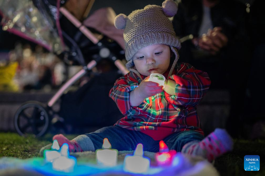 BOGOTÁ, 8 diciembre, 2024 (Xinhua) -- Imagen del 7 de diciembre de 2024 de un bebé jugando con velas artificiales durante el "Día de las Velitas", actividad que marca el inicio de las festividades navideñas en el Parque Simón Bolívar, en la ciudad de Bogotá, Colombia. (Xinhua/Andrés Moreno)