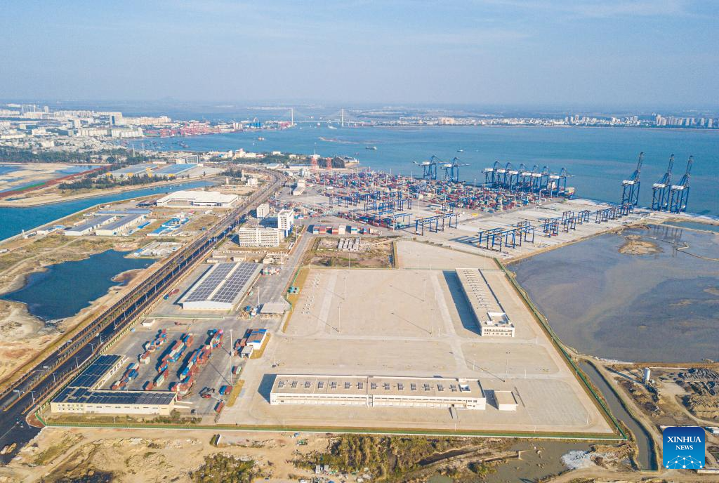 YANGPU, 13 enero, 2025 (Xinhua) -- Vista aérea tomada con un dron el 12 de enero de 2025 de un sitio de construcción de un proyecto de aduanas del Puerto de Yangpu, en la Zona de Desarrollo Económico de Yangpu, en Danzhou, en la provincia de Hainan, en el sur de China. (Xinhua/Pu Xiaoxu)