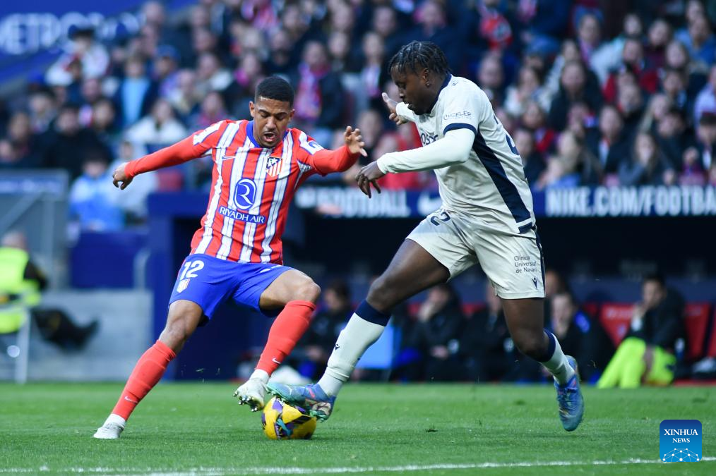 MADRID, 13 enero, 2025 (Xinhua) -- Imagen del 12 de enero de 2025 de Samuel Lino (i), de Atlético de Madrid, disputando el balón con Flavien Boyomo, de CA Osasuna, durante el partido de LaLiga española entre Atlético de Madrid y CA Osasuna, en Madrid, España. (Xinhua/Gustavo Valiente)