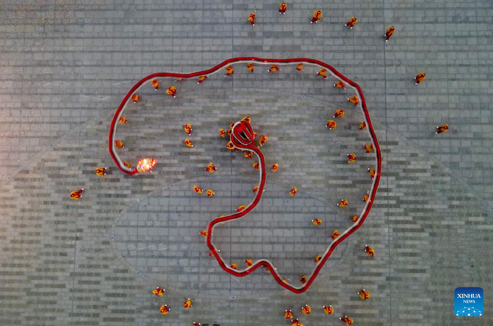 HEFEI, 23 enero, 2025 (Xinhua) -- Vista aérea tomada con un dron el 22 de enero de 2025 de una presentación de Linternas Yangshe de Feidong que muestra una linterna en forma de serpiente de 128 metros, en Hefei, capital de la provincia de Anhui, en el este de China. La presentación de Linternas Yangshe de Feidong es un patrimonio inmaterial a nivel nacional con una historia de más de seis siglos. (Xinhua/Zhou Mu)
