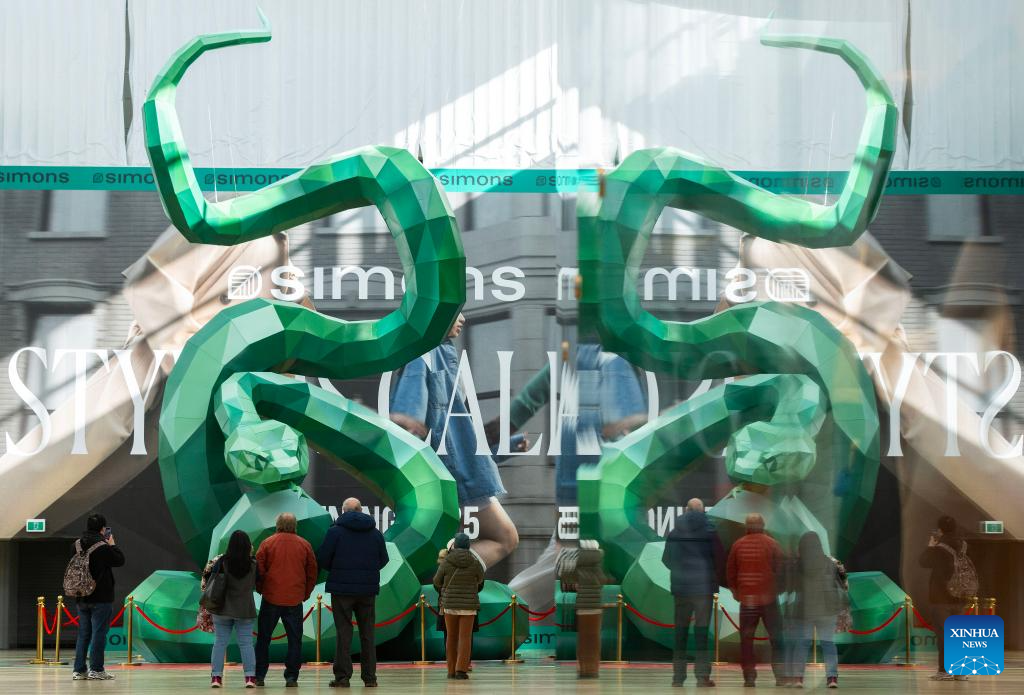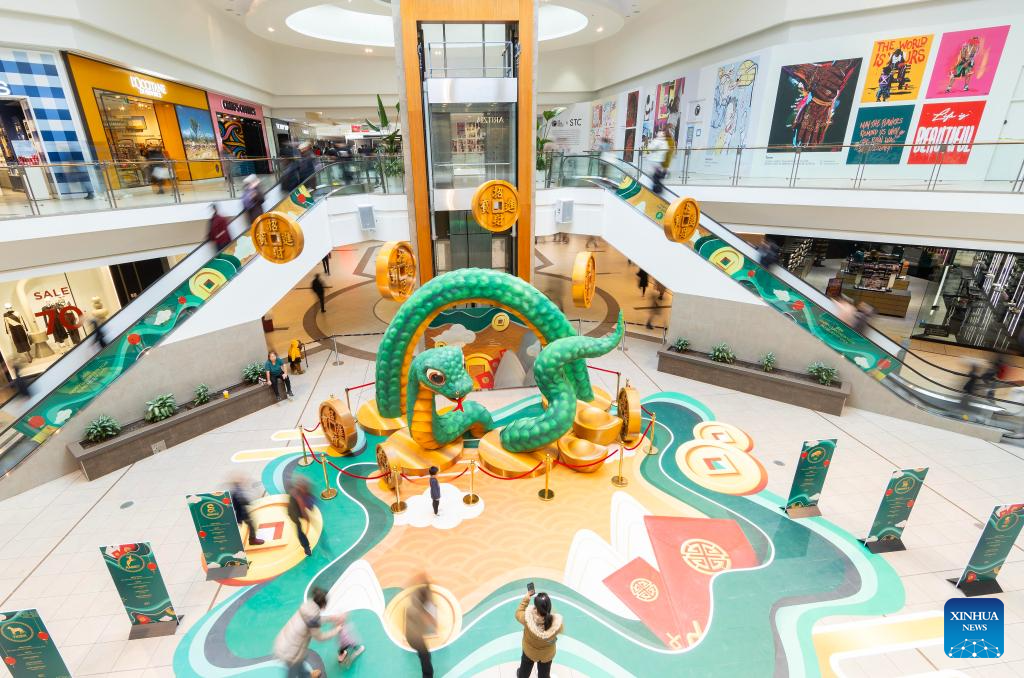 TORONTO, 28 enero, 2025 (Xinhua) -- Imagen del 27 de enero de 2025 de personas observando una instalación de serpiente en un centro comercial, en Toronto, Canadá. Los principales centros comerciales de Toronto han lanzado sus instalaciones de serpientes en celebración del próximo Año Nuevo Lunar, el Año de la Serpiente. (Xinhua/Zou Zheng)