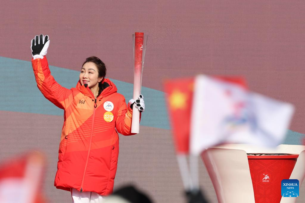 HARBIN, 3 febrero, 2025 (Xinhua) -- La portadora de la antorcha, Sui Wenjing, saluda a la audiencia durante la Ceremonia de Recuperación de Flama de los Juegos Asiáticos de Invierno 2025, en Harbin, en la provincia de Heilongjiang, en el noreste de China, el 3 de febrero de 2025. (Xinhua/Zhang Tao)
