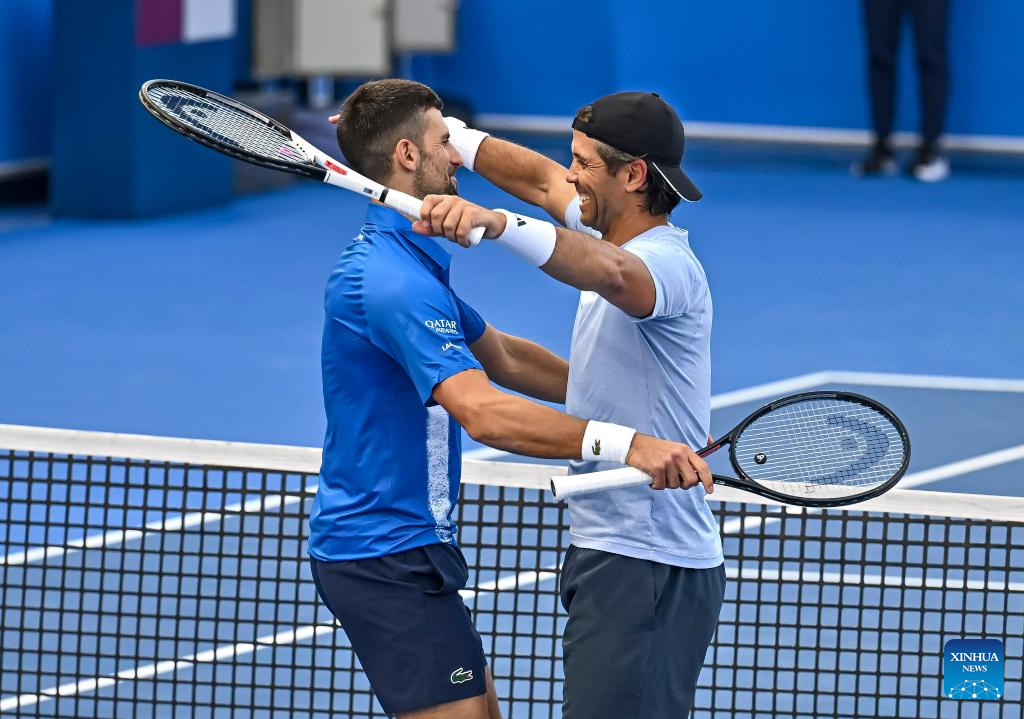 DOHA, 18 febrero, 2025 (Xinhua) -- Imagen del 17 de febrero de 2025 de Novak Djokovic (i) abrazando a Fernando Verdasco al término del partido de octavos de final de dobles masculinos entre Alexander Bublik, de Kazajistán/Karen Khachanov, de Rusia, y Novak Djokovic, de Serbia/Fernando Verdasco, de España, en el torneo de tenis Abierto de Qatar de la ATP, en Doha, Qatar. (Xinhua/Nikku)