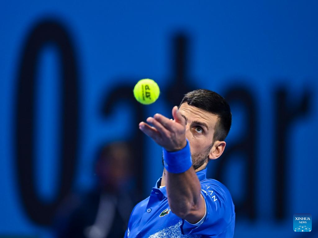 DOHA, 19 febrero, 2025 (Xinhua) -- Imagen del 18 de febrero de 2025 de Novak Djokovic, de Serbia, sirviendo la pelota durante el partido de dieciseisavos de final de individuales masculinos entre Matteo Berrettini, de Italia, y Novak Djokovic, de Serbia, en el torneo de tenis Abierto de Qatar de la ATP, en Doha, Qatar. (Xinhua/Nikku)