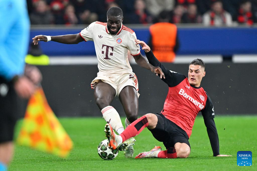 LEVERKUSEN, 12 marzo, 2025 (Xinhua) -- Imagen del 11 de marzo de 2025 de Patrik Schick (d), de Bayer 04 Leverkusen, disputando el balón con Dayot Upamecano, de Bayern Munich, durante el partido de fútbol de vuelta de octavos de final de la Liga de Campeones de la UEFA entre Bayer 04 Leverkusen y Bayern Munich, en Leverkusen, Alemania. (Xinhua/Ulrich Hufnagel)