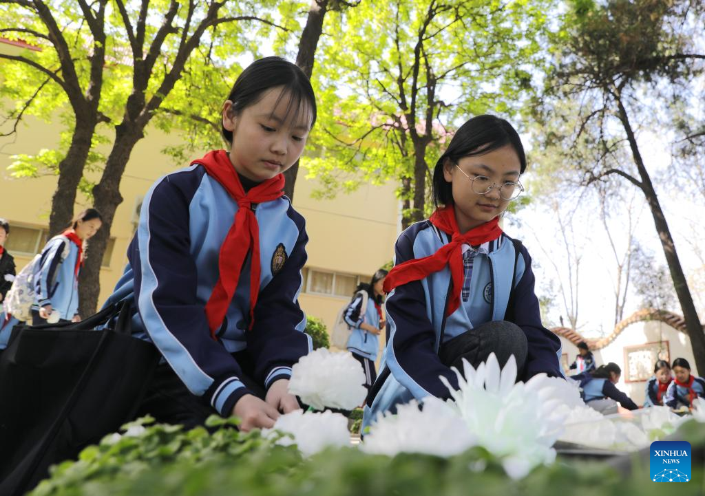 BEIJING, 2 abril, 2025 (Xinhua) -- Estudiantes rinden homenaje a los mártires en un cementerio de mártires, en la ciudad de Jiyuan de la provincia de Henan, en el centro de China, el 2 de abril de 2025. Personas de todo el país asisten a las actividades de limpieza de tumbas para rendir homenaje a los mártires previo al Festival Qingming, que se celebra el 4 de abril este año. (Xinhua/Duan Erping)