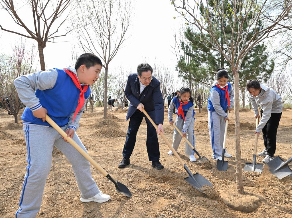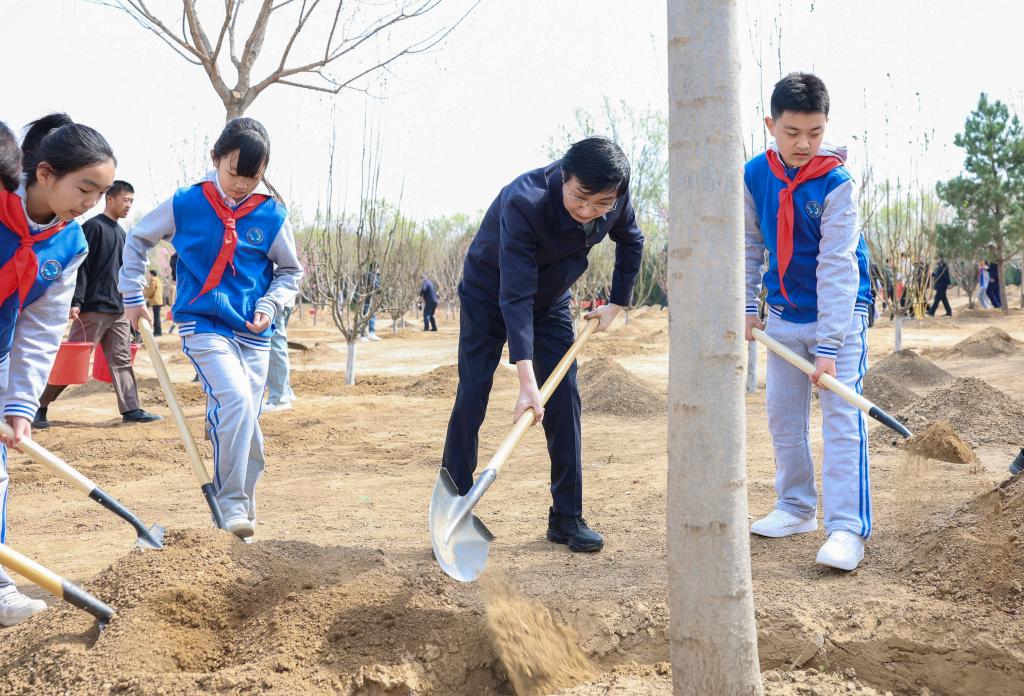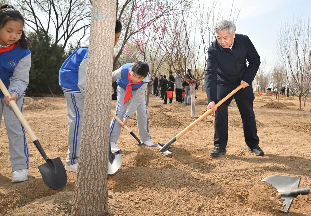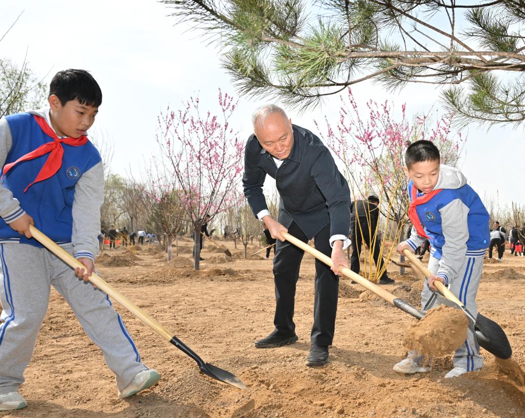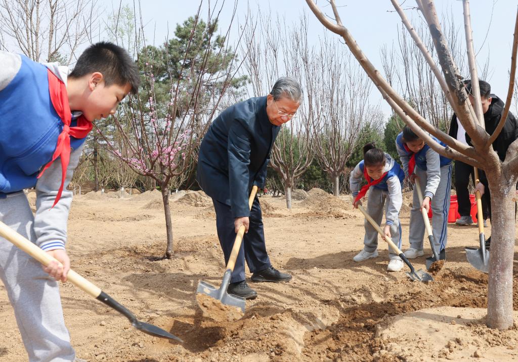 Xi y otros líderes del Partido y del Estado, entre ellos Li Qiang, Zhao Leji, Wang Huning, Cai Qi, Ding Xuexiang, Li Xi y Han Zheng, llegaron por la mañana al lugar de plantación de árboles a orillas de un río en el distrito de Fengtai y plantaron árboles con los funcionarios y los habitantes locales.