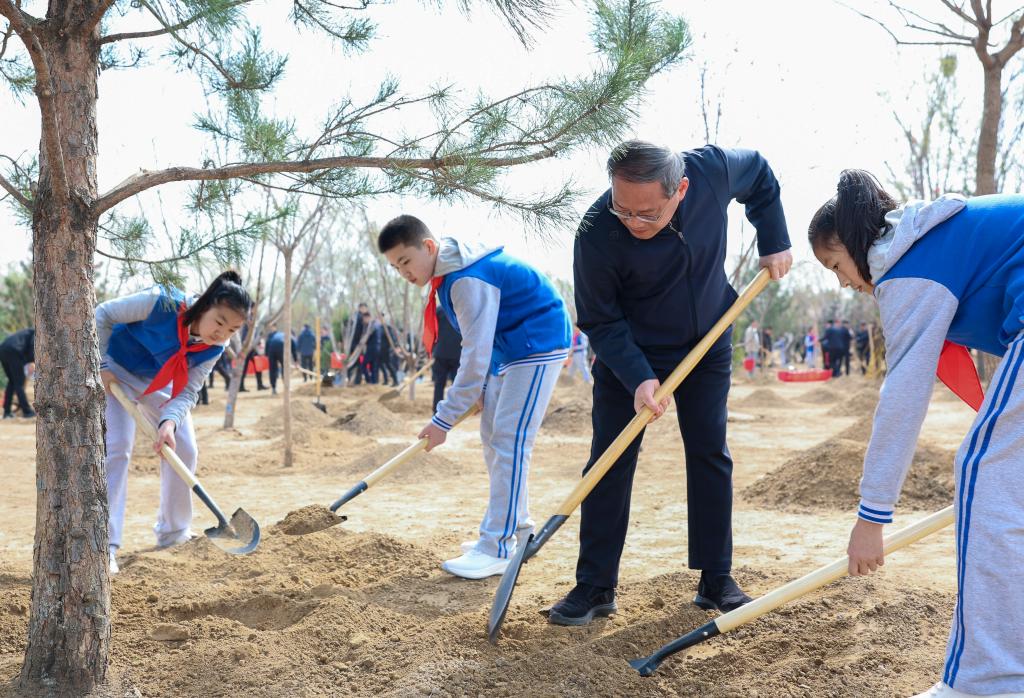 Li Qiang planta un árbol durante una actividad voluntaria de plantación de árboles, en el distrito de Fengtai de Beijing, capital de China, el 3 de abril de 2025. Xi Jinping y otros líderes del Partido y del Estado, entre ellos Li Qiang, Zhao Leji, Wang Huning, Cai Qi, Ding Xuexiang, Li Xi y Han Zheng, llegaron por la mañana al lugar de plantación de árboles a orillas de un río en el distrito de Fengtai y plantaron árboles con los funcionarios y los habitantes locales. (Xinhua/Liu Bin)