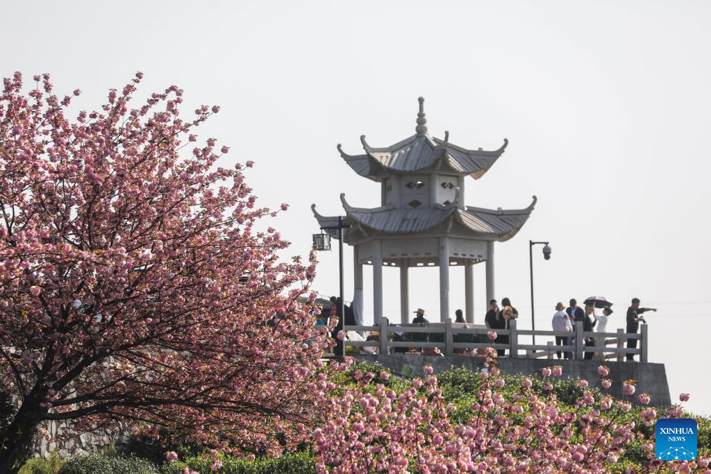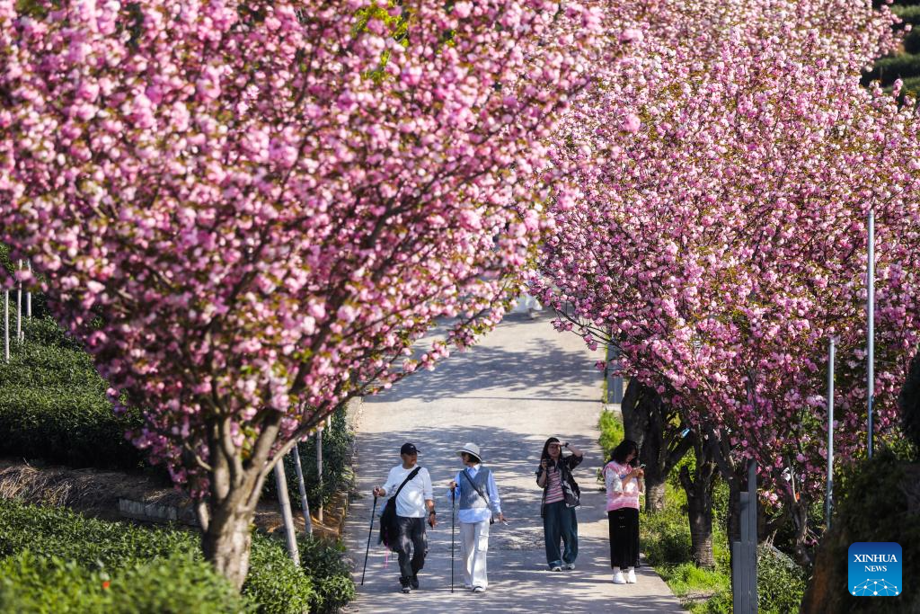 HANGZHOU, 6 abril, 2025 (Xinhua) -- Turistas observan flores de cerezo en un jardín de té, en la aldea de Bashan, en el distrito de Fuyang de la ciudad de Hangzhou, en la provincia de Zhejiang, en el este de China, el 6 de abril de 2025. Los cerezos en las vastas plantaciones de té en las montañas de la aldea de Bashan están en plena floración, lo que atrae a muchos turistas. (Xinhua/Xu Yu)