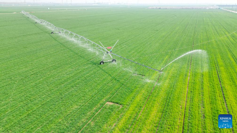 (250410) -- BEIJING, 10 abril, 2025 (Xinhua) -- Vista aérea tomada con un dron el 9 de abril de 2025 de un aspersor regando las cosechas en un campo, en Dongying, en la provincia de Shandong, en el este de China. (Xinhua/Liu Yunjie) (rtg) (ra) (vf)