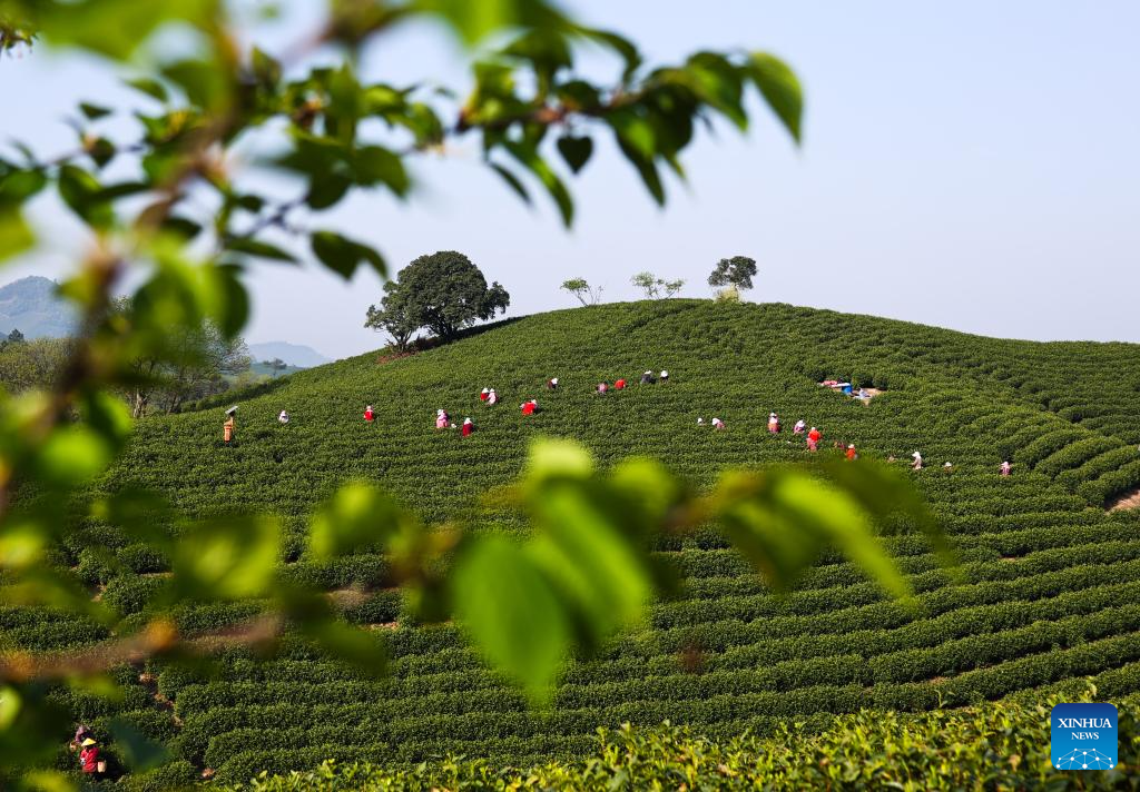 BEIJING, 10 abril, 2025 (Xinhua) -- Imagen del 9 de abril de 2025 de agricultores recolectando hojas de té en un jardín de té, en el distrito de Xuan'en, en la provincia de Hubei, en el centro de China. (Xinhua/Chen Xukai)