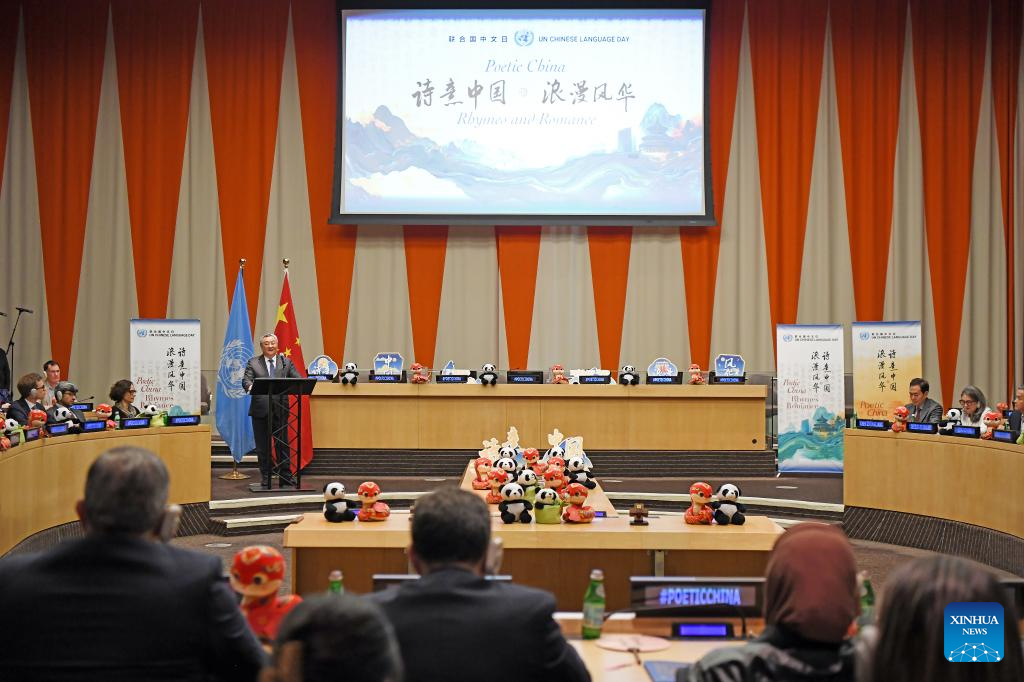 NACIONES UNIDAS, 16 abril, 2025 (Xinhua) -- Fu Cong, representante permanente de China ante la Organización de las Naciones Unidas (ONU), habla durante un evento conmemorativo del 16º Día del Idioma Chino de la ONU, en la sede de la ONU, en Nueva York, el 15 de abril de 2025. La ONU celebró su 16º Día del Idioma Chino el martes en su sede de Nueva York, ofreciendo una experiencia cultural inmersiva que fusionó la poesía y la música chinas. El evento de este año, "China Poética: Rimas y Romance", incluyó lecturas de poesía china, actuaciones musicales y una exposición sobre caracteres chinos. Más de 400 diplomáticos de la ONU, personal e invitados internacionales asistieron al evento. (Xinhua/Li Rui)