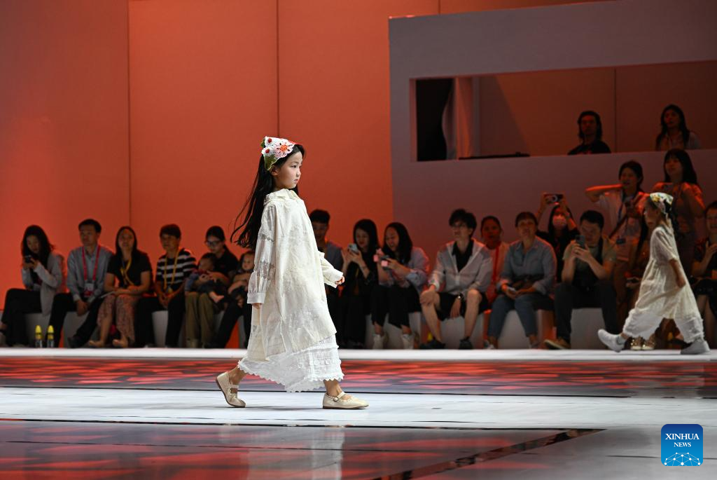 HAIKOU, 16 abril, 2025 (Xinhua) -- Niñas muestran ropa de marcas chinas durante un desfile de modas en la V Exposición Internacional de Productos de Consumo de China (CICPE, por sus siglas en inglés), en Haikou, en la provincia de Hainan, en el sur de China, el 16 de abril de 2025. Desde habilidades de patrimonio cultural inmaterial hasta productos tecnológicos de moda, las marcas chinas mostraron su encanto en la CICPE en curso en Haikou, atrayendo la atención de muchos visitantes. (Xinhua/Pu Xiaoxu)