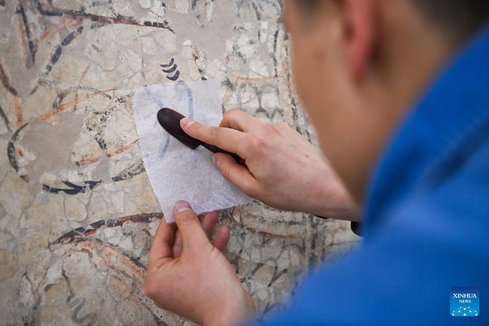 DATONG, 22 abril, 2025 (Xinhua) -- Imagen del 15 de abril de 2025 de Dai Yuxiang, un empleado del instituto de investigación de las Grutas de Yungang, restaurando un mural de las grutas en el instituto, en Datong, en la provincia de Shanxi, en el norte de China. Las Grutas de Yungang se construyeron durante la Dinastía Wei del Norte (386-534). Desde 2003, este sitio declarado Patrimonio de la Humanidad por la UNESCO ha iniciado la digitalización de sus 45 cuevas principales y más de 59.000 estatuas de piedra amenazadas por la erosión. Se ha utilizado tecnología de vanguardia para registrar los detalles de las obras de arte budistas, lo que ha allanado el camino para su reconstrucción digital en 3D. (Xinhua/Yang Chenguang)