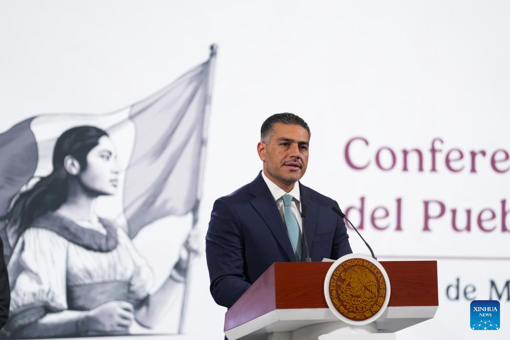 CIUDAD DE MEXICO, 8 mayo, 2025 (Xinhua) -- Imagen cedida por la Presidencia de México del secretario de Seguridad y Protección Ciudadana mexicano, Omar García Harfuch, hablando durante la conferencia de prensa matutina de la presidenta mexicana, Claudia Sheinbaum, en Palacio Nacional, en la Ciudad de México, capital de México, el 8 de mayo de 2025. Alrededor del 75 por ciento de las más de 10.000 armas incautadas de octubre de 2024 a abril de 2025 en México proviene de Estados Unidos, señaló el jueves García Harfuch. (Xinhua/Presidencia de México)