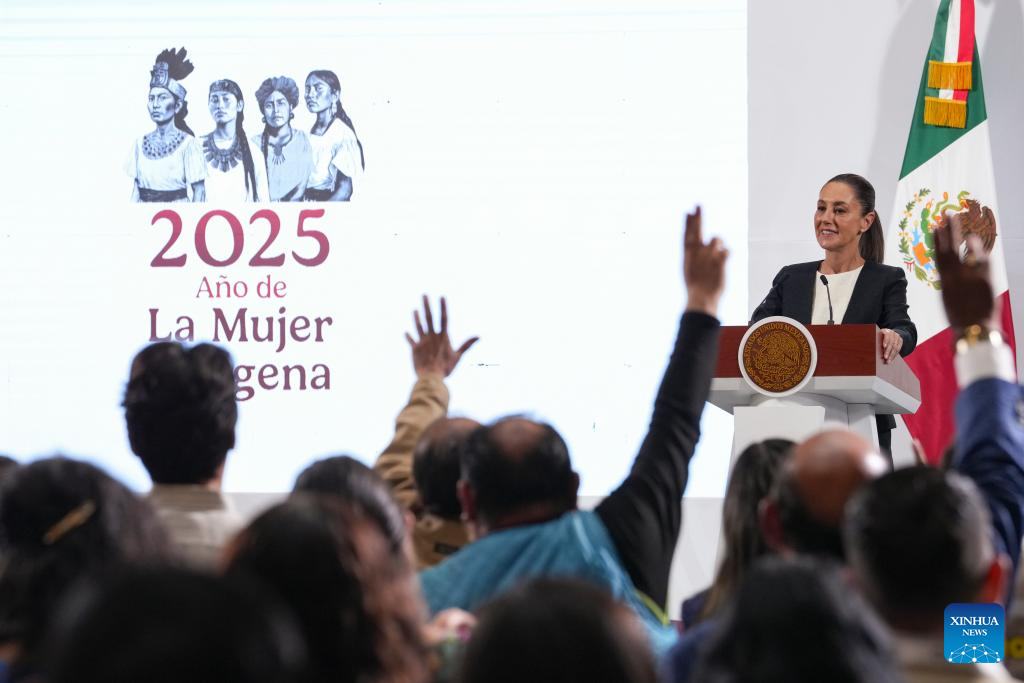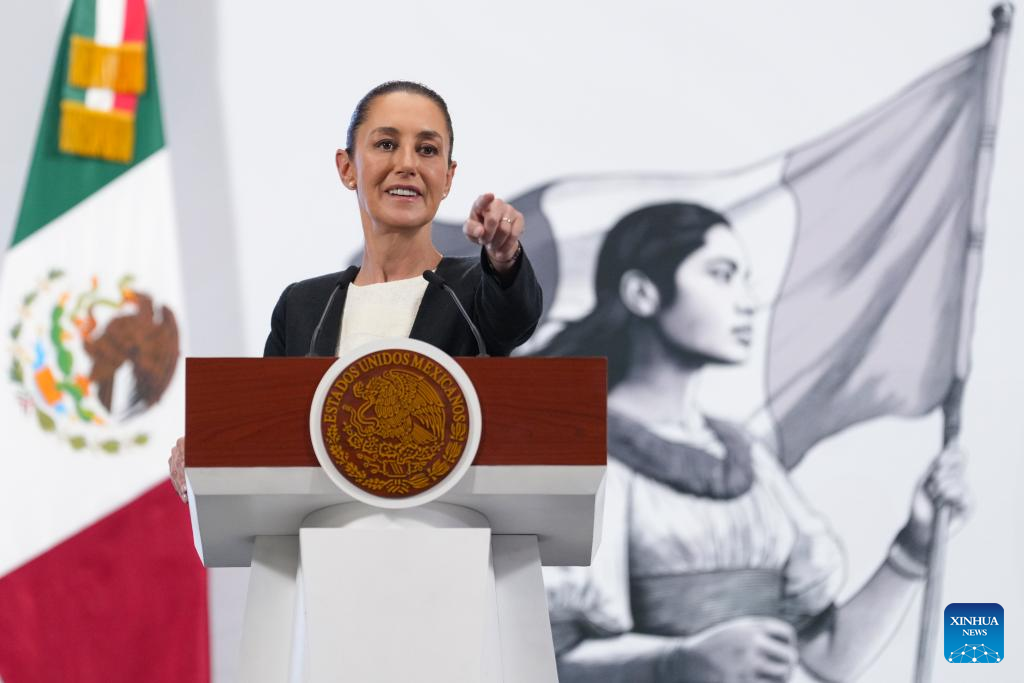 CIUDAD DE MEXICO, 8 mayo, 2025 (Xinhua) -- Imagen cedida por la Presidencia de México de la presidenta mexicana, Claudia Sheinbaum, reaccionando durante su conferencia de prensa matutina en Palacio Nacional, en la Ciudad de México, capital de México, el 8 de mayo de 2025. Alrededor del 75 por ciento de las más de 10.000 armas incautadas de octubre de 2024 a abril de 2025 en México proviene de Estados Unidos, señaló el jueves el secretario (ministro) de Seguridad y Protección Ciudadana, Omar García Harfuch. (Xinhua/Presidencia de México)